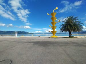 広島県側の生口島にある謎のオブジェのあるビーチでレンタサイクルを借りてスタート。