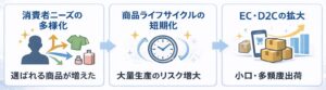 流行や市場変化のスピードが上がり、大量に作って長期間販売するモデルは、在庫リスクを伴うものになりました。初回ロットを抑え、売れ行きを見ながら補充する動きが一般化しています。